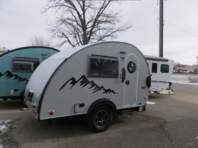 This T@B CSS BD, from nuCamp, sleeps two people and its exterior is silver with black trim.