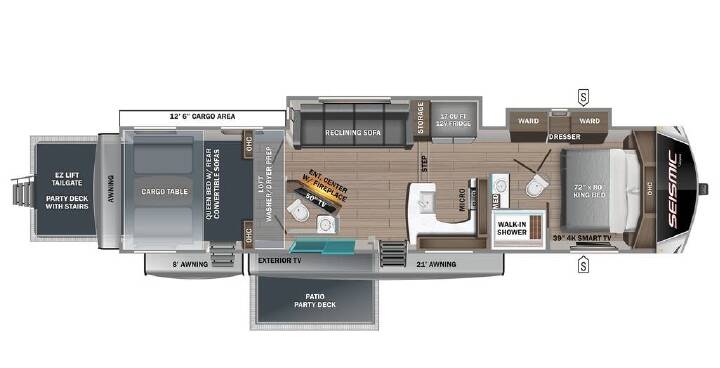 Not actual photos of stock #61268. The Seismic Luxury Series combines luxury and functionality for a camping experience like no other. From the three full-body paint options to optional double patio decks, the rest of the campground will be in awe of this coach! The 2023 Seismic Luxury includes an automotive style front windshield in the bedroom and an industry-exclusive 2 vacuum-bonded and laminated garage floor.