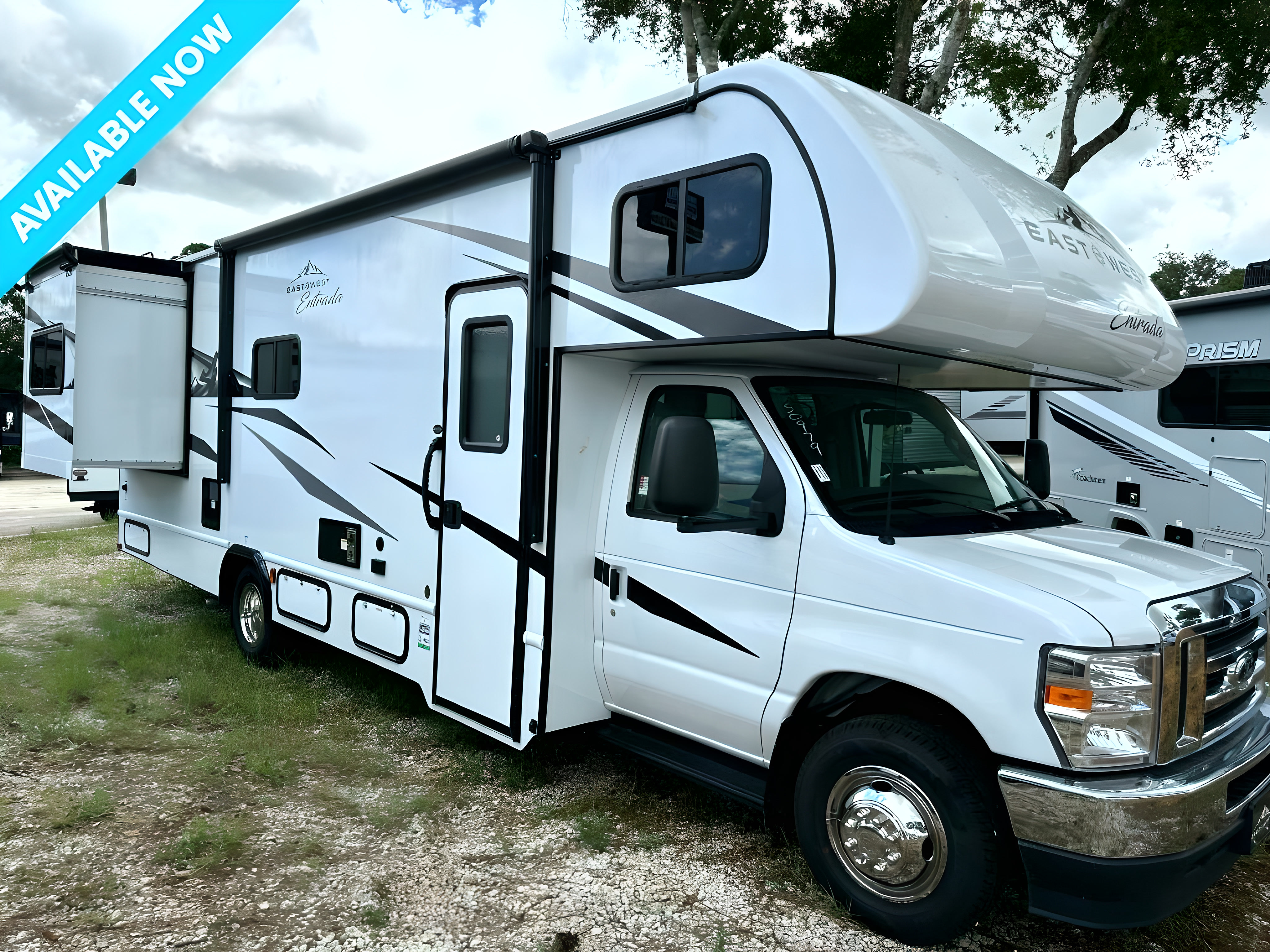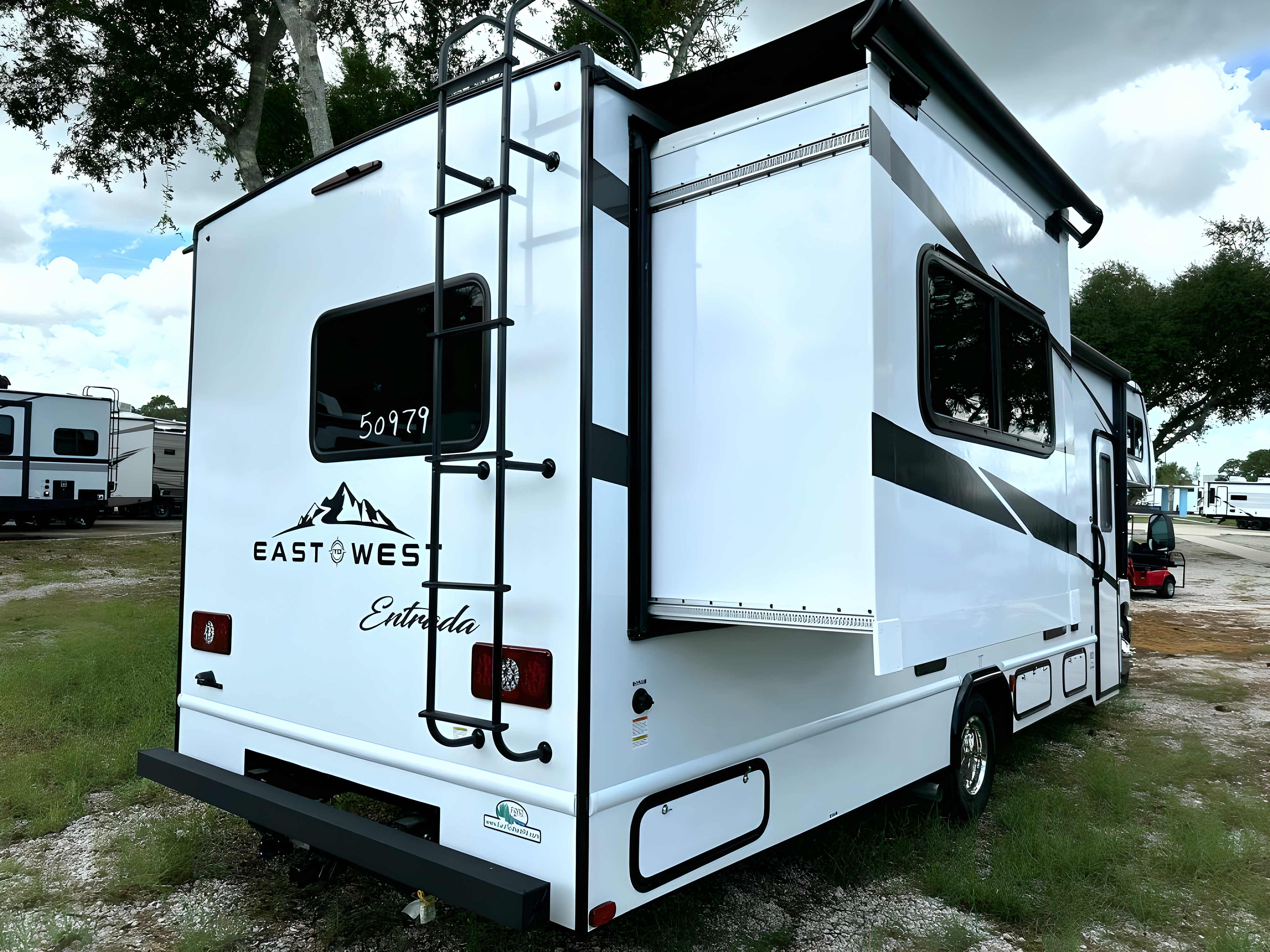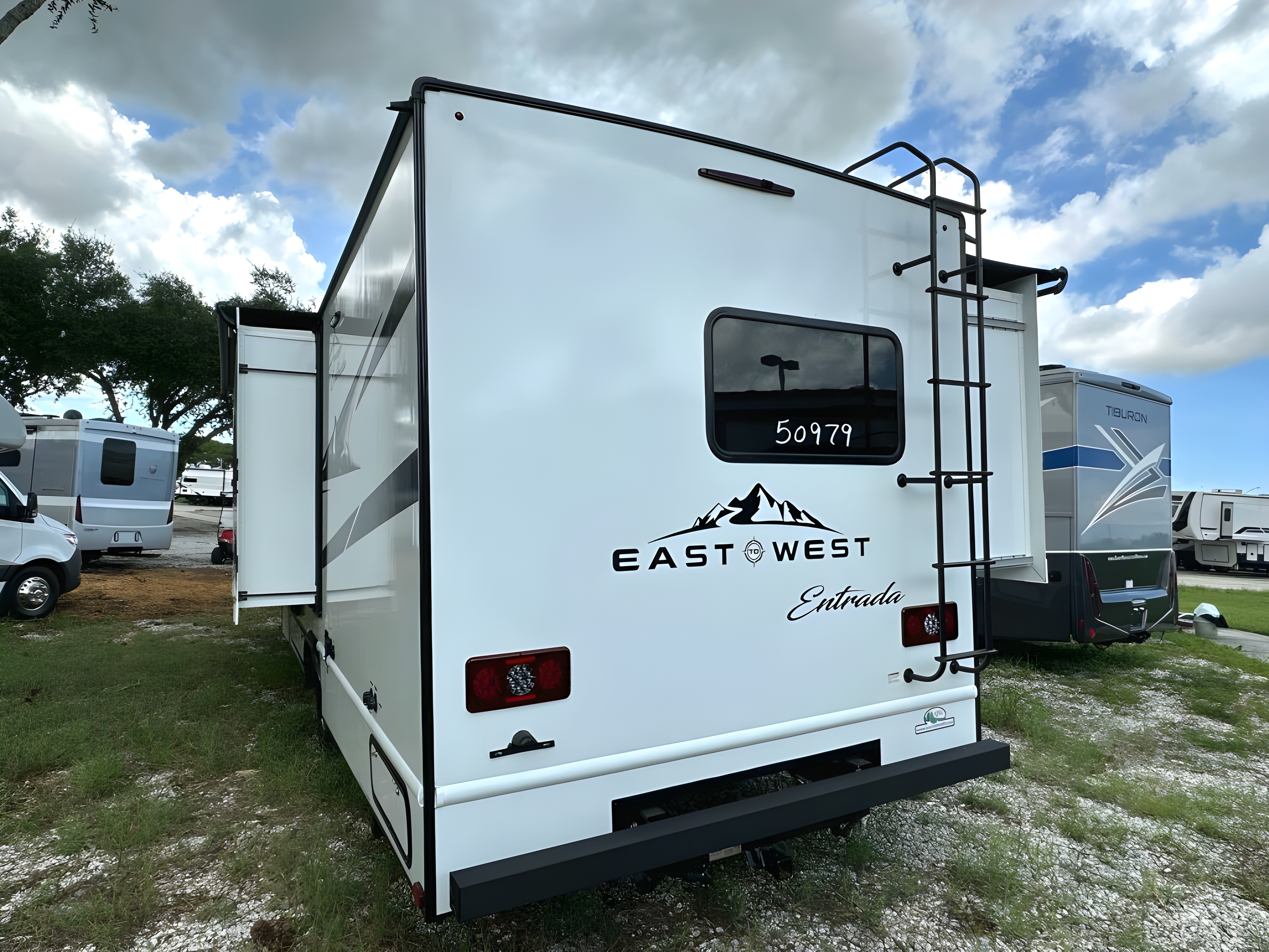2024 EAST TO WEST Entrada, 2600 DS, Class C, Air Conditioning (BTUs) (13500),Air Conditioning (Standard),Air Conditioning Prewiring (Yes),Air Conditioning Type (Automatic),Anti-Lock Brakes (Standard),Awning (Standard),Awning Length (ft) (12),Awning Length (m) (3.7),Back-Up Camera (Yes),Bathroom (Standard),Bathroom Flooring Type (Vinyl),Bathroom Location (Rear),Bathroom Medicine Cabinet (Standard),Bathroom Medicine Cabinet Location (Rear),Bathroom Mirror (Standard),Bathroom Mirror Location (Rear),Bathroom Sink (Standard),Bathroom Sink Location (Rear),Bathroom Vent / Fan System (Standard),Bathroom Vent / Fan System Location (Rear),Battery (Standard),Battery Power Converter (Yes),Beds (Standard),Black Water Holding Tank Gauge (Standard),Bluetooth® Audio (Yes),Body Material (Aluminum),Brakes (Standard),Cable Prewiring (Yes),Carbon Monoxide Detector (Standard),Carburetion (Standard),Carburetion Type (Fuel Injected),Chassis Brand (Ford),Chassis Model (E350),Construction (Standard),Convection (Yes),Cruise Control (Standard),Curtains / Shades (Standard),Cylinders (8),Displacement (l) (7.3),Door Type (Plastic / Glass),Doors (Standard),Emergency Exit(s) (Standard),Engine (Standard),Engine Type (V8),Exterior Flood Lights (Standard),Exterior Ladder (Standard),Exterior Plugs (Standard),Exterior Shower (Standard),Fireplace (Standard),Freeze Proof Insulation (Standard),Fresh Water Holding Tank Gauge (Standard),Front Brake Type (Hydraulic Disc),Fuel Requirements (Regular),Fuel Type (Gas),Gray Water Holding Tank Gauge (Standard),Ground Fault Plugs (Standard),Heat Prewiring (Yes),Heater (BTUs) (35000),Heater (Standard),Heater Type (Automatic),Horsepower (bhp) (325),Horsepower (kW) (242.5),Horsepower RPM (3750),Interior Decor (Standard),Interior Wood Finish (Yes),Kitchen / Living Area (Standard),Kitchen / Living Area Flooring Type (Vinyl),Kitchen Location (Center),Kitchen Table Configuration (Bench Seats),Layout (Oven / Stove),Leveling Jacks (Optional),Living Area Location (Front),Master Bedroom (Standard),Master Bedroom Door Style (Accordion),Master Bedroom Flooring Type (Vinyl),Master Bedroom Location (Rear),Master Bedroom Shades / Curtains (Yes),Max Sleeping Count (8),Microwave Oven (Standard),Number Of Bathrooms (1),Number Of Convertible / Sofa Beds (2),Number Of Emergency Exits (1),Number Of Oven Burners (3),Number Of Queen Size Beds (2),Number Of Radios (1),Number Of Rows (1),Number Of Seats (2),Number Of Sofas (1),Number Of Speeds (6),Number Of Televisions (1),Number of Awnings (1),Number of Doors (1),Number of Slideouts (2),Oven / Stove (Standard),Overdrive (Yes),Overhead Fan (Yes),Paint (Standard),Pass-Thru Storage (Standard),Power Retractable Awning (Yes),Prewiring (Standard),Propane Alarm (Standard),Propane Tank Cover (Standard),Propane Tank Gauge (Standard),Radio (Standard),Rear Brake Type (Hydraulic Disc),Rear Bumper Drain Hose Carrier (Standard),Rear Video Backup Camera (Standard),Reclining Seats (Yes),Refrigerator (Standard),Refrigerator Power Mode